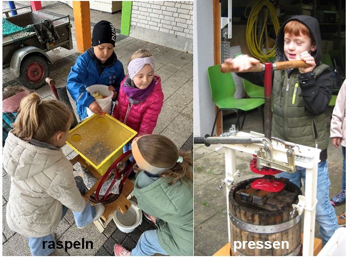 Ein herzliches Dankeschön gilt dem ortsansässigen Obst- und Gartenbauverein, der uns Äpfel gespendet und sein Vereinsgelände zur Verfügung gestellt hat. Aufgrund des Wetters konnten leider nur zwei Klassen das Vereinsgelände nutzen. Die anderen Klassen haben die Apfelsaftherstellung in die Schule verlagert.